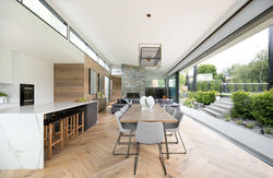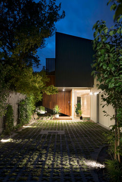 Hidden House is not seen from the street but when discovered provides a generous journey into its heart. The house entices you along the slender plan. Like a game of hide and seek, it both conceals its private zones while unveiling itself. Revealed at the end a living room filled with light and space that could not have been anticipated when starting down the beautifully landscaped private lane to its entry. The large sliding doors allow you to fully appreciate and become part of a residential oasis despite being built in to all sides.